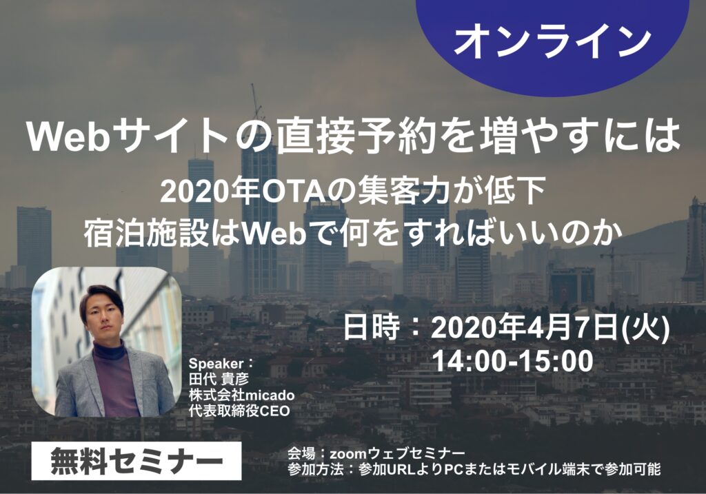 4/7【セミナー情報】Webサイトの直接予約を増やすには〜ホテル・旅館の販路拡大を行うために〜