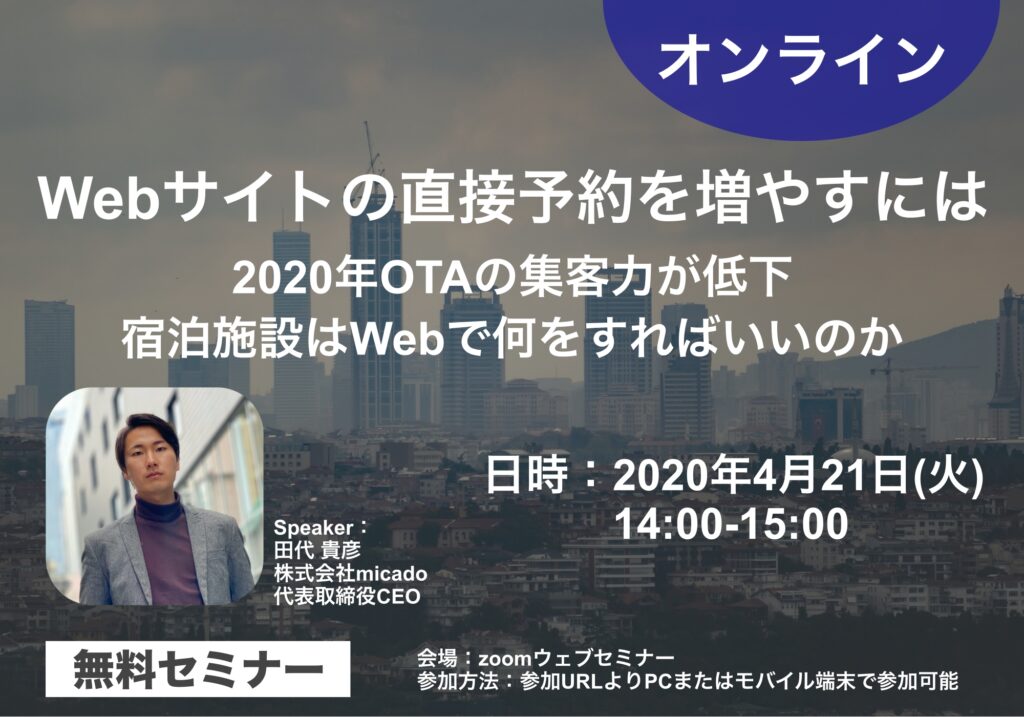 4/21【セミナー情報】Webサイトの直接予約を増やすには〜ホテル・旅館の販路拡大を行うために〜