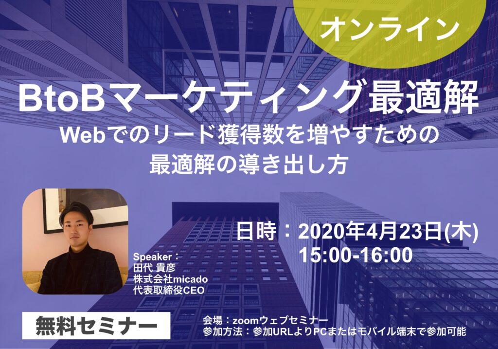 4/9【セミナー情報】BtoBマーケティング最適解〜Webでリード獲得数を増やすための最適解の導き出し方〜